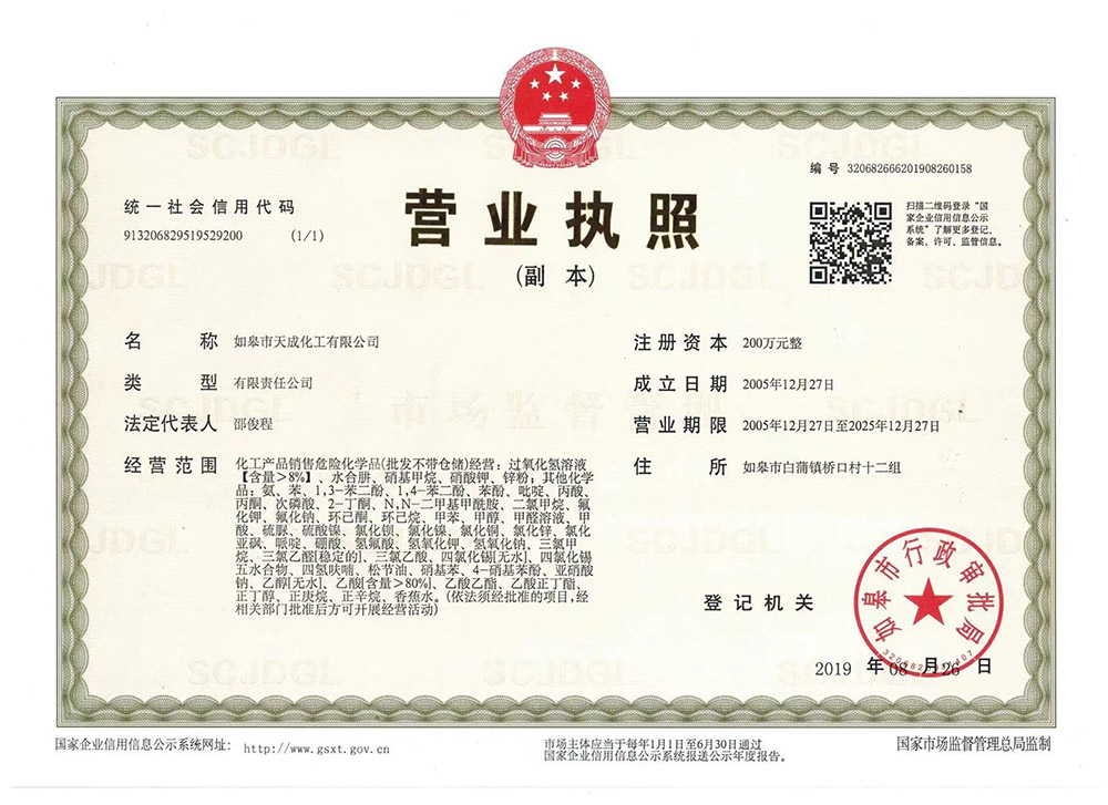 ? 如皋市天成化工有限公司創(chuàng)建于1996年。公司地處于美麗富饒的長(zhǎng)江三角洲,座落在古鎮(zhèn)林梓,通揚(yáng)運(yùn)河河畔。南瀕長(zhǎng)江、西臨204國(guó)道,距南通港、飛機(jī)場(chǎng)30公里,立體交通發(fā)達(dá)。公司經(jīng)營(yíng)管理規(guī)范,技術(shù)力量雄厚,擁有一批高、中級(jí)專業(yè)技術(shù)人才。